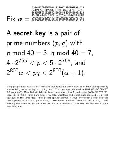 Number-theoretic cryptography workshop October 16, 2000 - October 20, 2000